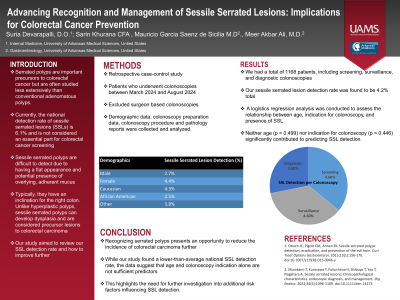 We had a total of 1168 patients, including screening, surveillance, and diagnostic colonoscopies. Our sessile serrated lesion detection rate was found to be 4.2% total. A logistics regression analysis was conducted to assess the relationship between age, indication for colonoscopy, and presence of SSLs. The results showed that neither age (p = 0.499) nor indication for colonoscopy (p = 0.446) significantly contributed to predicting SSL detection.