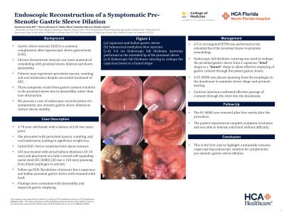 Anatomical remodeling and gastric sleeve dysmotility of a gastric sleeve due to chronic downstream gastric stenosis is an underrecognized sequence of complications following laparoscopic sleeve gastrectomy (LSG). Patients may present with persistent nausea, vomiting, and oral intolerance in spite of successful treatment of gastric sleeve stenosis due to retention of gastric contents in the proximal sleeve. We present a case of endoscopic reconstruction of symptomatic pre-stenotic gastric sleeve dilation.