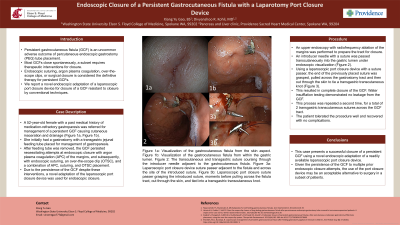 This case presents a successful closure of a persistent GCF using a novel endoscopic adaptation of a readily available laparoscopic port closure device. Given the persistence of the GCF despite multiple prior endoscopic interventions, the use of the port closure device may be an acceptable alternative to surgery in a subset of patients.