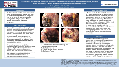 70-year-old female established with newly diagnosed gallbladder adenocarcinoma with extrahepatic biliary obstruction treated with ERCP and transpapillary biliary stenting experienced progression of disease, requiring surgical intervention to be aborted due to invasion into the right hepatic lobe. Patient underwent repeated intervention with plan to optimize for chemotherapy, including celiac plexus neurolysis and repeat ERCP for upsizing to metal biliary stenting when she endorsed new fevers and progressive failure to thrive.