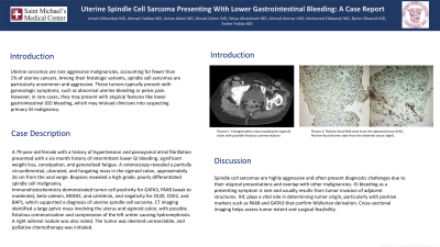 Uterine sarcomas are rare aggressive malignancies, accounting for fewer than 1% of uterine cancers. Among their histologic variants, spindle cell sarcomas are particularly uncommon and aggressive. These tumors typically present with gynecologic symptoms, such as abnormal uterine bleeding or pelvic pain. However, in rare cases, they may present with atypical features like lower gastrointestinal (GI) bleeding, which may mislead clinicians into suspecting primary GI malignancy.