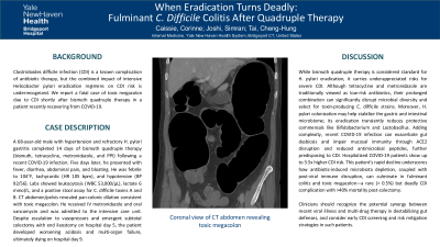 A 68-year-old male with hypertension and refractory H. pylori gastritis completed 14 days of bismuth quadruple therapy (bismuth, tetracycline, metronidazole, and PPI) following a recent COVID-19 infection. Five days later, he presented with fever, diarrhea, abdominal pain, and bloating. He was febrile to 104°F, tachycardic (HR 105 bpm), and hypotensive (BP 92/56). Labs showed leukocytosis (WBC 53,000/μL), lactate 6 mmol/L, and positive stool assay for C. difficile toxins A and B. CT abdomen/pelvis revealed pan-colonic dilation consistent with toxic megacolon. He received IV metronidazole and oral vancomycin and was admitted to the ICU. Despite escalation to vasopressors and emergent subtotal colectomy with end ileostomy on hospital day 5, the patient developed worsening acidosis and multi-organ failure, ultimately dying on hospital day 9.