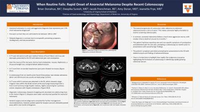 On admission, a CT abdomen pelvis with IV contrast revealed a large, irregular mass within the distal rectum at the anal verge measuring 6.6 cm by 4.0 cm with numerous large hepatic lesions, suggestive of a primary colonic neoplasm with hepatic metastasis. The patient then underwent diagnostic colonoscopy which showed a fungating and ulcerated non-obstructing large mass in the rectum just proximal to the anal verge. Biopsies were taken and returned positive for anorectal melanoma. General surgery and medical oncology were consulted for further management recommendations, however the patient opted for hospice care given her poor prognosis.