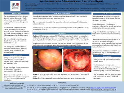 Synchronous colorectal carcinoma is the identification of multiple primary colorectal carcinomas in a single patient. Synchronous colorectal carcinoma is rare, with a prevalence ranging from 1.1% to 8.1% and a male-to-female ratio of 1.8:1. The average age at presentation of patients with synchronous colorectal cancer is in the early half of the seventh decade.