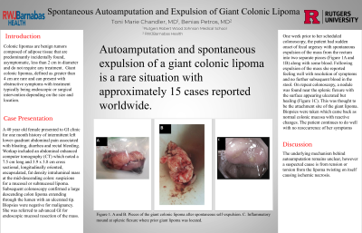 To our knowledge, this case highlights a rare situation of autoamputation and spontaneous expulsion of a giant colonic lipoma with approximately 15 cases reported worldwide. The underlying mechanism behind autoamputation remains unclear, however a suspected cause is tension or torsion from the lipoma twisting on itself causing ischemic necrosis.