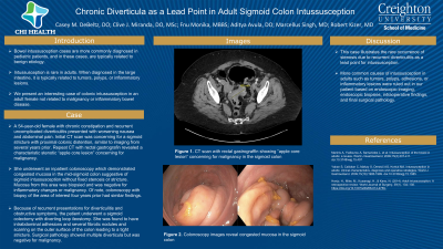 This case illustrates the rare occurrence of stenosis due to recurrent diverticulitis as a lead point for intussusception. More common causes of intussusception in adults such as tumors, polyps, adhesions, or inflammatory lesions were ruled out in our patient based on endoscopic imaging, endoscopic biopsies, intraoperative findings, and final surgical pathology.