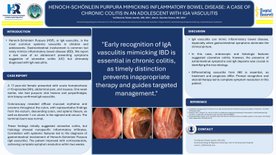 Henoch-Schönlein Purpura (HSP), or IgA vasculitis, is the most common systemic vasculitis in children and adolescents. Gastrointestinal involvement is common but rarely mimics inflammatory bowel disease (IBD). We report a rare case of an adolescent presenting symptoms suggestive of ulcerative colitis (UC) but ultimately diagnosed with IgA vasculitis