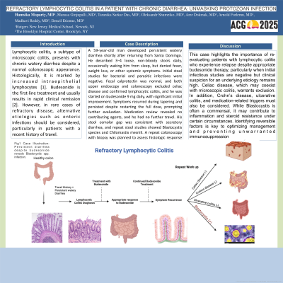 This case highlights the importance of re-evaluating patients with lymphocytic colitis who experience relapse despite appropriate budesonide therapy, particularly when initial infectious studies are negative but clinical suspicion for an underlying etiology remains high. Celiac disease, which may coexist with microscopic colitis, warrants exclusion. In addition, Crohn’s disease, ulcerative colitis, and medication-related triggers must also be considered. While Blastocystis is often a commensal, it may contribute to inflammation and steroid resistance under certain circumstances. Identifying reversible factors is key to optimizing management and preventing unwarranted immunosuppression.