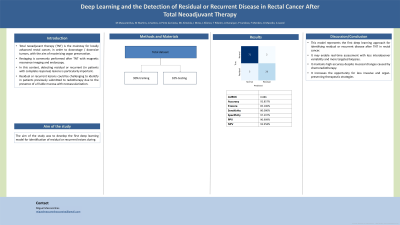 Total neoadjuvant therapy (TNT) is a mainstay for locally advanced rectal cancer, in order to downstage / downsize tumors, with the aim of maximizing organ preservation. Restaging is commonly performed after TNT with magnetic resonance imaging and endoscopy. In this context, detecting residual or recurrent (in patients with complete response) lesions is particularly important. Residual or recurrent lesions could be challenging to identify in patients previously submitted to radiotherapy due to the presence of a friable mucosa with neovascularization. In this context, our group tried to develop the first deep learning model for identification of residual or recurrent lesions during proctosigmoidoscopy in patients with rectal cancer submitted to TNT.