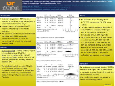 Several databases were reviewed from inception to May 18, 2025, to identify RCTs comparing the outcomes of U-CSP vs conventional CSP in small colorectal lesions. Our outcomes of interest were en bloc resection, R0 resection, perforation, bleeding, and mean resection time. We calculated risk ratios (RRs) with 95% CI for categorical variables and mean differences with 95% CI for continuous variables. Data was analyzed using the random effect model. Heterogeneity was assessed using I 2 statistics.