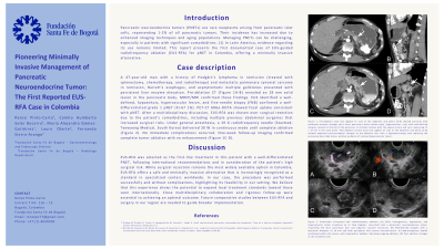 Introduction: Pancreatic neuroendocrine tumors (PNETs) are rare neoplasms arising from pancreatic islet cells, representing 1-2% of all pancreatic tumors. Their incidence has increased due to enhanced imaging techniques and aging populations. Managing PNETs can be challenging, especially in patients with significant comorbidities. In Latin America, evidence regarding its use remains limited. This report presents the first documented case of EUS-guided radiofrequency ablation (EUS-RFA) for PNET in Colombia, offering a minimally invasive alternative.