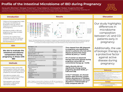 Jacquelin Blomker, MD1, Morgan Freeman, MD1, Ying Gibbens, MD, PhD2, Christopher Staley, PhD1, Eugenia Shmidt, MD1. P1169 - Profile of the Intestinal Microbiome of Inflammatory Bowel Disease During Pregnancy, ACG 2025 Annual Scientific Meeting Abstracts. Phoenix, AZ: American College of Gastroenterology.