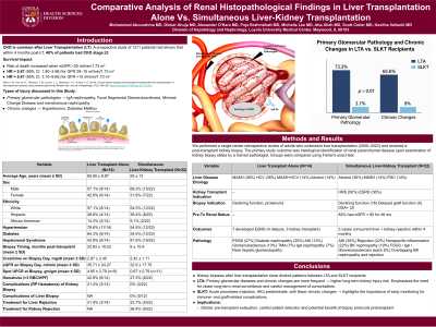 Introduction: Chronic kidney disease (CKD) is common in solid organ transplant recipients (SOT). Due to immune tolerance, liver transplant recipients often require less immunosuppression than other SOT. Renal histopathology may differ between LTA and simultaneous liver-kidney transplant (SLKT) recipients due to distinct clinical profiles, but no direct comparison has been reported.