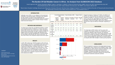 Preethi Jagannath, MBBS1, Moataz Aboeldahb, MBBCh2, Eugene C. Nwankwo, MD, MS3, Hadi Khaled. Abou Zeid, MD3, Ahmed Abdelmaksoud, MD4, Sri Satya Sai Prashanth Polasu, MBBS3, Simran Joshi, MD5, Marquise Soto, MD6, Pujitha Vallivedu Chennakesavulu, MD, MBBS7, Lewis Roberts, MBChB, PhD3. P2143 - The Burden of Gallbladder Cancer in Africa: An Analysis From GLOBOCAN 2022 Database, ACG 2025 Annual Scientific Meeting Abstracts. Phoenix, AZ: American College of Gastroenterology.