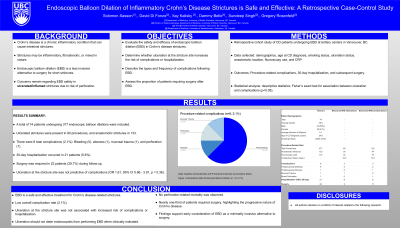 Discussion: EBD is a safe and effective therapy for CD strictures. Despite theoretical concerns, ulceration at the stricture site did not significantly increase complications or postprocedural hospitalizations. Overall complication rates were low. Nearly one-third of patients ultimately required surgery, underscoring the progressive nature of Crohn’s Disease, thereby highlighting appropriate treatment at an earlier stage of the disease.
