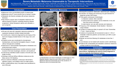 Case Description/Methods: A 56-year-old male with metastatic melanoma presented with a new rash following immunotherapy initiation. He was diagnosed two months earlier with imaging revealing widespread lesions in the lungs, liver, spleen, and subcutaneous tissues. He was admitted for suspected checkpoint inhibitor-related dermatitis although his hospital course was complicated by hematemesis, hematochezia, and recurrent hemoglobin drops to ~6 g/dL without hemodynamic instability. Abdominal CT demonstrated hepatosplenic metastases and enhancing bowel nodules. Esophagogastroduodenoscopy revealed extensive nodular mucosa in the lower esophagus, stomach, and duodenum. Colonoscopy identified smaller nodules in the left colon with friable mucosa. Histology confirmed diffuse infiltrative melanoma as the likely source of GI bleeding. Due to extensive infiltration, endoscopic interventions, palliative surgery, or radiation were not viable. After multidisciplinary input, the patient was transitioned to end of life care.