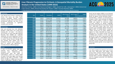Shamikha Cheema, MBBS1, Shan Muhammad Mughal, MBBS1, Haseeb Faiz, MD2, Laiba Sarfraz, MBBS1, Muhammad Faique Hassan, MBBS1, Muhammad Shaheer Bin Faheem, MBBS3, Hussnain Mushtaq, MBBS1. P5861 - Liver Fibrosis Progression to Cirrhosis: A Geospatial Mortality Burden Analysis in the United States (1999-2023), ACG 2025 Annual Scientific Meeting Abstracts. Phoenix, AZ: American College of Gastroenterology.