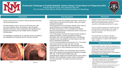 A 66 year old male with a history of idiopathic ileocolonic varices. Alternative etiologies (ie portal hypertension, thrombotic disease) were excluded with fibroscan and contrasted cross-sectional imaging. Patient has family members with similar findings on colonoscopy including his twin brother, sister, and mother. His initial colonoscopy in 2012, prompted by a positive fecal immunochemical test, showed pancolonic varices and multiple small adenomas. Two < 5mm polyps removed with biopsy forceps resulted in significant bleeding, requiring epinephrine injection, hemostatic clips, and overnight observation. Hematology evaluation was unremarkable; low-dose aspirin was held prior to subsequent procedures.