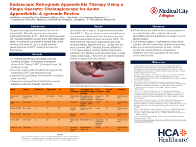 Introduction: Surgery has long been the standard of care for appendicitis. Recently, endoscopic retrograde appendicitis therapy (ERAT) has emerged as a novel non-surgical treatment usually done with fluoroscopy. Here, we aimed to summarize available data on the efficacy and safety of using a single-operator cholangioscope for ERAT without the need for fluoroscopy.