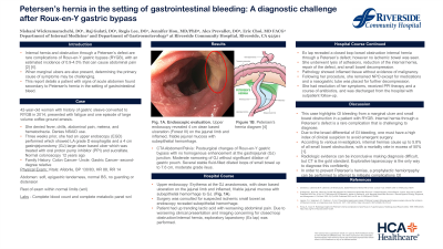 Introduction: Internal hernia and obstruction through a Petersen’s defect are complications of Roux-en-Y gastric bypass (RYGB), with an estimated incidence of 0.9-4.5%. This report details a patient with signs of acute abdomen and who was found to have an ischemic bowel due to Petersen's hernia in the setting of gastrointestinal bleed (GI).