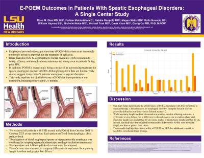 Ross M. Dies, MD, MS1, Farhan Mohiuddin, MD2, Natalie Roppolo, MD3, Megan Maloz, BS2, Sofia Novacic, BS3, William Haynes, BS3, Michelle Neice, MD4, Michael Tran, MD5, Omar Khan, MD5, Qiang Cai, MD, PhD, MACG6. P2756 - E-POEM Outcomes in Patients With Spastic Esophageal Disorders: A Single Center Study, ACG 2025 Annual Scientific Meeting Abstracts. Phoenix, AZ: American College of Gastroenterology.