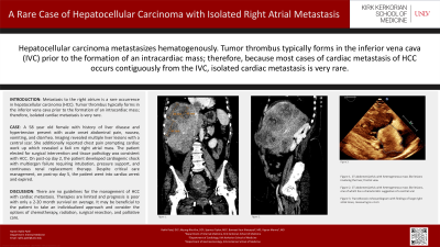 Discussion: There are no guidelines for the management of HCC with isolated cardiac metastasis. Since intravascular invasion occurs in the late stages of HCC, the prognosis of right atrial metastasis is poor and therapy is limited to systemic chemotherapy and radiation. It may be beneficial to approach treatment options with management of the underlying liver disease and consider chemotherapy, radiation, surgical resection, or palliative care on an individual basis.