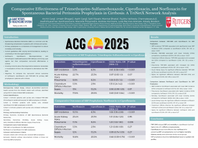 Archit Garg, MD1, Umesh Bhagat, MD2, Aashi Garg, MD3, Sahil Raval, MD1, Mannat Bhatia, MD1, Pujitha Vallivedu Chennakesavulu, MD, MBBS4, Aadhithyaraman Santharaman, MD1, Marcella Pimpinelli, MD1, Andrew Korman, MD1, Louisa Recinos-Arenas, MD1, Arkady Broder, MD, FACG1. P1493 - Comparative Effectiveness of Trimethoprim-Sulfamethoxazole, Ciprofloxacin, and Norfloxacin for Spontaneous Bacterial Peritonitis Prophylaxis in Cirrhosis: A TriNetX Network Analysis, ACG 2025 Annual Scientific Meeting Abstracts. Phoenix, AZ: American College of Gastroenterology.