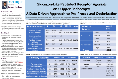 Danial Nadeem, MD1, Tejas Nikumbh, MD2, Daniel Satterfield, CRNP3, James Dove, MS3, Craig Wood, MS3, Peter Benotti, MD3, Harshit S. Khara, MD4, Amitpal Johal, MD3, Christopher Still, DO3. P0853 - Glucagon-Like Peptide-1 Receptor Agonists and Upper Endoscopy: A Data-Driven Approach to Pre-Procedural Optimization, ACG 2025 Annual Scientific Meeting Abstracts. Phoenix, AZ: American College of Gastroenterology.
