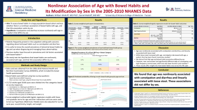 William Matloff, MD, PhD1, Daniel Matloff, MD, MS2. P0792 - Nonlinear Association of Age With Bowel Habits and Its Modification by Sex in the NHANES (2005-2010), ACG 2025 Annual Scientific Meeting Abstracts. Phoenix, AZ: American College of Gastroenterology.