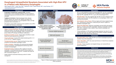 Case Description/Methods: A 56-year-old male with a history of GERD and remote tobacco use presented with ongoing dysphagia, heartburn, and odynophagia despite high-dose proton pump inhibitor therapy and lifestyle modifications. Physical examination revealed a leukoplakic lesion on the right lateral tongue, confirmed via partial glossectomy to be invasive keratinizing SCC (pT1, G2, negative margins). Subsequent esophagogastroduodenoscopy (EGD) revealed mild esophagitis without Barrett’s esophagus. Biopsies from the mid-esophagus demonstrated EIN. Immunohistochemical staining of the esophageal biopsy showed strong nuclear and cytoplasmic positivity for p16 and Ki-67 in the middle two-thirds of the squamous epithelium, consistent with high-risk human papillomavirus (HPV) involvement. Workup was negative for HSV, CMV, and eosinophilic esophagitis. The patient was referred for endoscopic mucosal resection and ablation therapy.