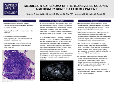 A 71-year-old woman with atrial fibrillation, heart failure with reduced ejection fraction, coronary artery disease, diabetes, and hypothyroidism presented with dyspnea, palpitations, and edema. Blood workup showed (hemoglobin 11.6 g/dL), and the Iron panel showed iron deficiency anemia (ferritin 48 ng/mL, TIBC 410 µg/dL). Non-contrast abdominal CT (Computed Tomography) revealed a 3.8 × 4.5 cm mass in the transverse colon with regional lymphadenopathy and a sub-centimeter omental nodule. Colonoscopy was performed and revealed a large, fungating, partially obstructing lesion 65 cm from the anal verge. Biopsies confirmed poorly differentiated medullary carcinoma. Due to cardiovascular instability, the need for ongoing anticoagulation, and malnutrition, surgery was deferred. Oncology was consulted and recommended outpatient Imaging and molecular profiling to guide systemic treatment.