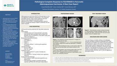 Introduction: Adenosquamous carcinoma of the pancreas (ASCP) is a rare and aggressive subtype of exocrine pancreatic cancer, defined histologically by ≥30% squamous differentiation alongside glandular elements. It accounts for 1–4% of pancreatic malignancies and is associated with a worse prognosis and lower chemotherapy responsiveness than pancreatic ductal adenocarcinoma (PDAC). Pathologic complete response (pCR) to neoadjuvant therapy in ASCP is exceedingly rare. This case illustrates a remarkable therapeutic outcome and its clinical implications